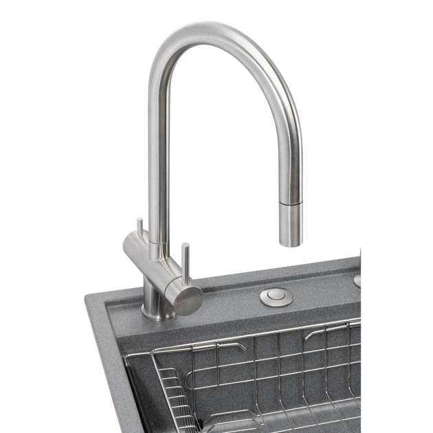 Благодаря смесителю GRANADO Ferrol с выдвижным изливом вы сможете ополаскивать посуду и мыть овощи в корзине, прицельно и экономно используя воду. Аэратор Neoperl будет дополнительно уменьшать расход воды, а керамический картридж Sedal и комплектующие премиум-качества обеспечат длительную эксплуатацию смесителя без нюансов.