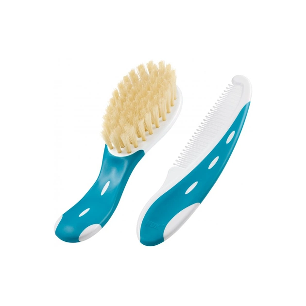 NUK очень мягкая щетка с натуральной щетиной нежно массирует кожу головы вашего малыша. Щетка идеально подходит для детей первых месяцев жизни, чья голова покрыта нежным пушком. Расческа с частыми зубцами с закругленными кончиками предохраняет кожу головы от царапин. Щетка и расческа для волос изготовлены из прочного безопасного материала, а эргономичная форма ручки позволяет удобно держать их во время причесывания.