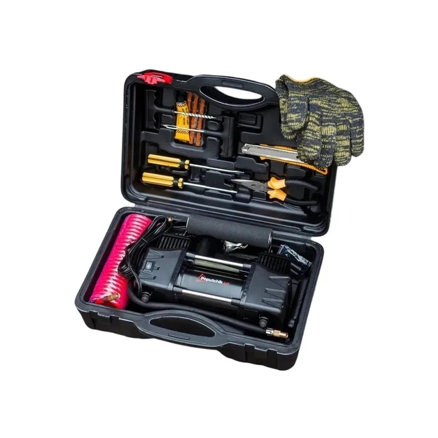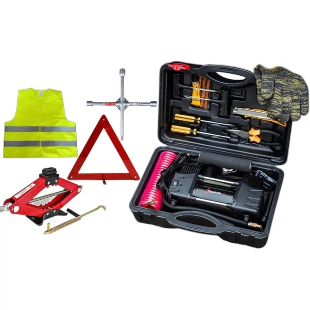 Автомобильный компрессор 2-поршневой Poputchik Домкрат ромбовый Баллонный крестовой ключ Poputchik Жилет сигнальный зеленый Знак аварийной остановки "BOTTARI" Набор кейса: Перчатки Ремкомплект для шин Шило с насечками Шило с ушком Отвертки (плоская и крестовая) Плоскогубцы Строительный нож