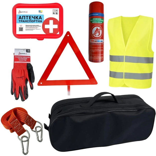 Огнетушитель ВВПА - 400М (аэрозольный, морозостойкий, рабочий диапазон температур от -30°C до +50°C)Сумка-органайзер черная, на 2 отделения 50 х 18 х 18 смПерчатки рабочие с нитриловым покрытиемТрос буксирный 5 т 5 м Poputchik в сумкеЖилет сигнальный зеленыйАптечка медицинская транспортная Poputchik согласно ТУ (02-003-П) пластиковый футлярЗнак аварийной остановкиИнструкция по набору