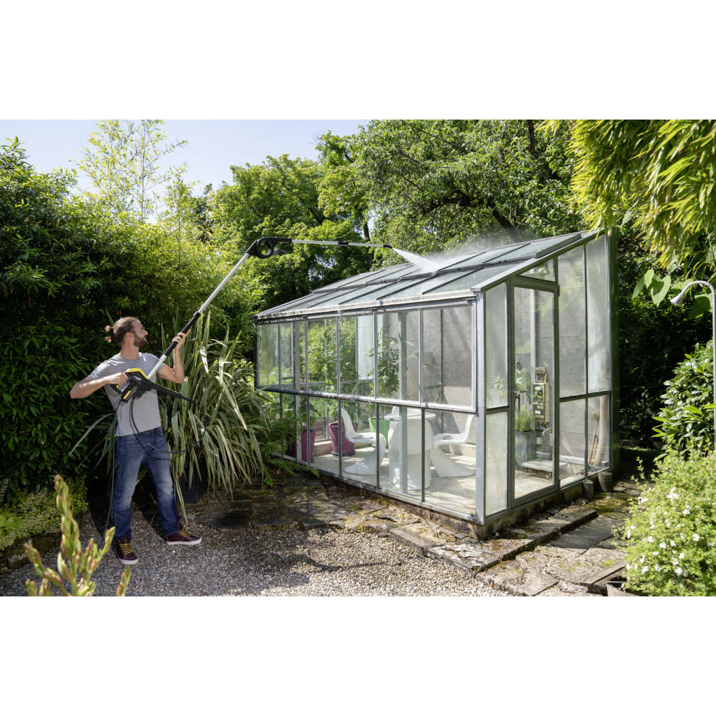 При помощи телескопической струйной трубки можно быстро и легко очищать труднодоступные места, в т. ч. высоко расположенные участки фасадов. Еще одним ее преимуществом является наличие поворачивающегося на 180° шарнира, позволяющего очищать стекла зимних садов, наклонные крыши или навесы для автомобилей.
