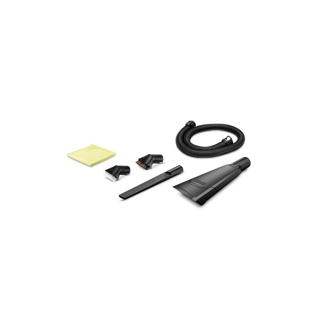 Набор Karcher для уборки в автомобіле - 6 единиц, 0.725 кг 2.863-304.0. Благодаря большому набору аксессуаров, состоящему из 1,5-метрового удлинительного шланга, удлиненной щелевой насадки, автомобильной насадки, всасывающей щетки с жесткой щетиной, всасывающей щетки с мягкой щетиной и салфетки из микроволокна для гладких поверхностей и поверхностей окон. как детская игра – и машина становится безупречно чистой зоной хорошего самочувствия.