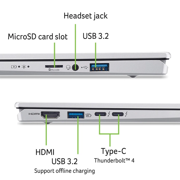 Для подключения и мультимедийных возможностей Swift Go 14 предлагает широкий набор интерфейсов и функций. Порты USB Type-A и USB4 позволяют подключать внешние мониторы или накопители, а HDMI обеспечивает совместимость с современными дисплеями. WiFi 802.11ax и стандарт Bluetooth гарантируют быстрое и стабильное соединение.