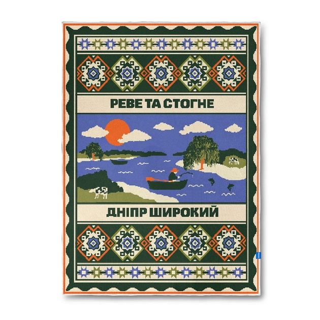 Иллюстрация пледа сочетает традиционные для этих регионов орнаменты и характерный пейзаж центра. Бескрайние пейзажи, живописные холмы и широкий Днепр создают особую атмосферу этого края. А еще он содержит легендарную, всеми известную, цитату Тараса Шевченко, которая передает величие и душу этой земли.