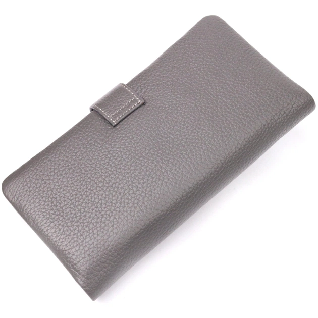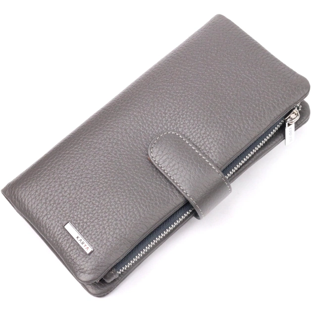 Вертикальный женский кошелек из натуральной зернистой кожи, в красивом сером цвете. Внутренний разворот состоит из четырех открытых отделений для купюр, одного кармана с расширителем на застежке, одного скрытого кармана на молнии, одного кармана-перегородки на молнии, одного сетчатого карманчика и двенадцати секций для пластиковых карт. Складывается аксессуар пополам, с фиксацией на хлястик с магнитом. Такой кошелек из натуральной кожи - это идеальный вариант на каждый день для тех, кто ценит качество, удобство и комфорт.