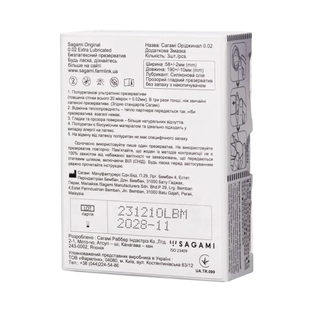 Презервативы Sagami Original 0.02 Полиуретановые с дополнительной смазкой 3 шт. (4974234100040)