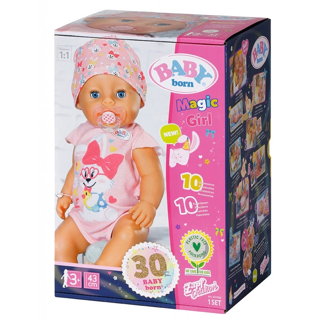 Встречайте новинку от BABY born! Играть с куклой серии «Нежные объятия» – ВОЛШЕБНАЯ ДЕВОЧКА стало ещё интереснее и веселее! Кукла-пупс одета в милое розовое боди и шапочку. Теперь игра с куколкой стала еще интереснее, благодаря «волшебной» пустышке. Глазки куколки открываются или закрываются с помощью поворотов пустышки, когда она находится у неё во рту. Чтобы кукла уснула, достаточно просто повернуть пустышку и ее глазки закроются, в каком бы положении она не была. Но также она может уснуть и без пустышки. Просто положите ее в кроватку или на ручки, и она сразу же закроет глазки! Эти новые возможности делают игры с BABY born более реалистичными.