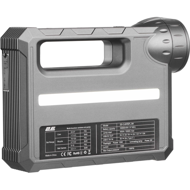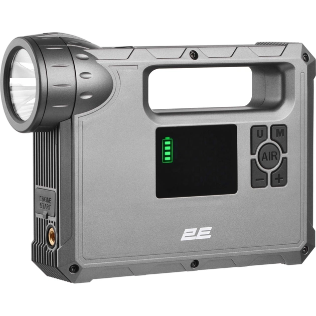 Это универсальное устройство 2E Pitman сочетает в себе высокоэффективное пусковое устройство, компактный автомобильный компрессор, мощный фонарь, а также функции зарядного устройства со встроенной батареей известной емкости 10000 mAh/37Wh.