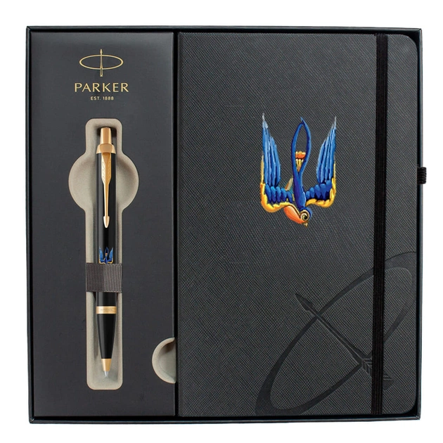 Набір Parker IM UKRAINE Black GT BP Тризуб-Ластівка 22032b24_T1230u - стильний подарунковий набір із найпопулярнішої колекції, що складається з кулькової ручки і блокнота для записів. Матеріал корпусу ручки і ковпачка - ювелірна латунь, покриття - глянцеве лакове, оздоблення деталей - pvd-позолота, колір - чорний. Лінія письма - тонка, колір чорнила - чорний. Виконана в класичному дизайні. Блокнот сірого кольору, з твердою палітуркою і розміткою в лінійку, закривається на гумку. Розмір - 134*210 мм.