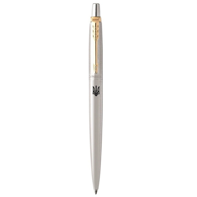 Parker JOTTER Stainless Steel GT BP_Трезубец (полированный стальной дизайн с гравировкой и позолотой) - эксклюзивная шариковая ручка из линейки культовых пишущих инструментов JOTTER (Джотер). Оригинальная ручка дополнена лазерной гравировкой Герба Украины черного цвета.