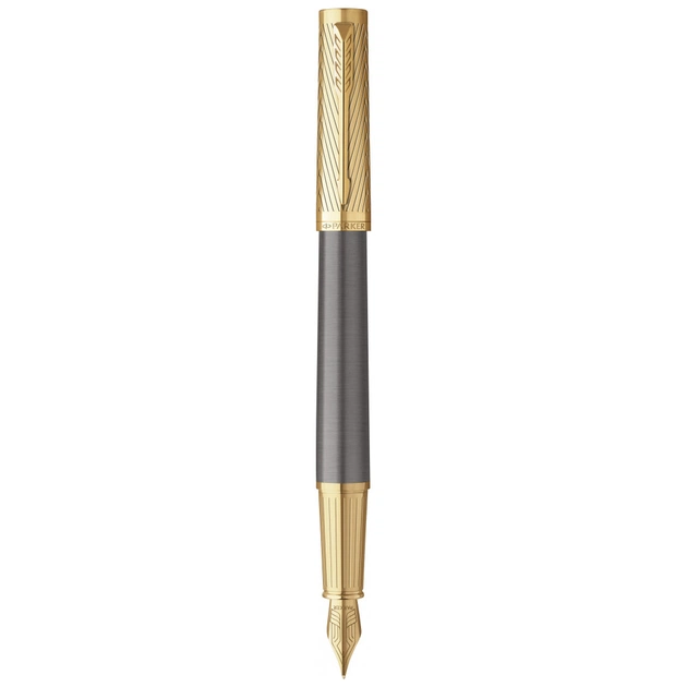 Перовая ручка Parker INGENUITY из лимитированной серии Parker Pioneers. Благородный ансамбль в сочетании серого и золотого. Позолоченный колпачок украшен химически вытравленным узором в виде елки. Зажим-стрела Parker и грипп-секция также позолочены. Ручка Parker INGENUITY Pioneers GT оснащена стальным позолоченным пером с современным гравировальным дизайном. Размер и вес комфортны для мужчин, но и женщины эта ручка не оставит равнодушными.
