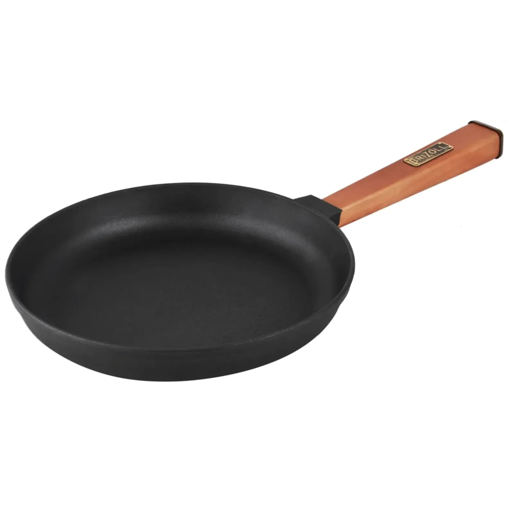 Brizoll Optima чугунная сковорода популярного диаметра подходит для жарки и тушения разнообразных блюд для всей семьи. Имеет удобную деревянную ручку (ольха), которая комфортно лежит в руке и не нагревается. Сковорода не покрыта дополнительно антипригарным покрытием, которое со временем разрушается. А, напротив, обладает природными антипригарными свойствами, возрастающими с увеличением срока эксплуатации.