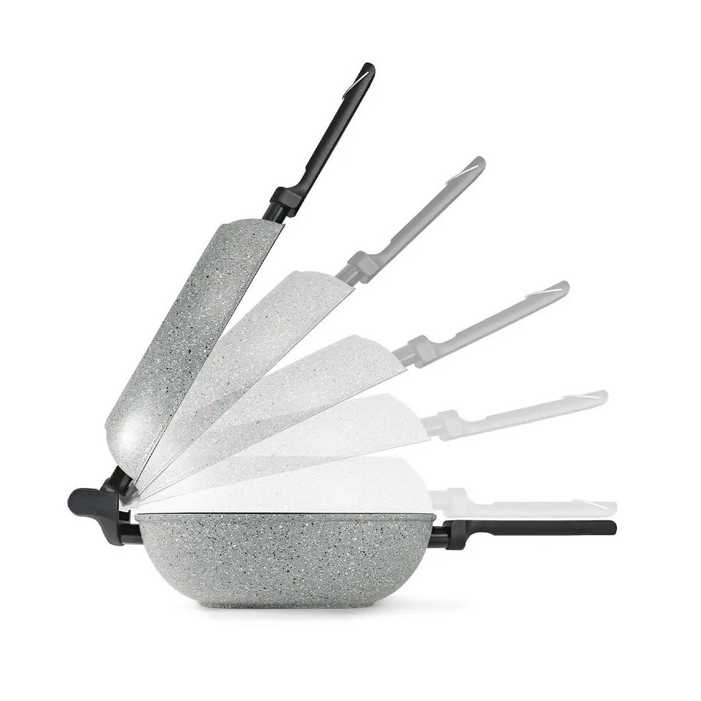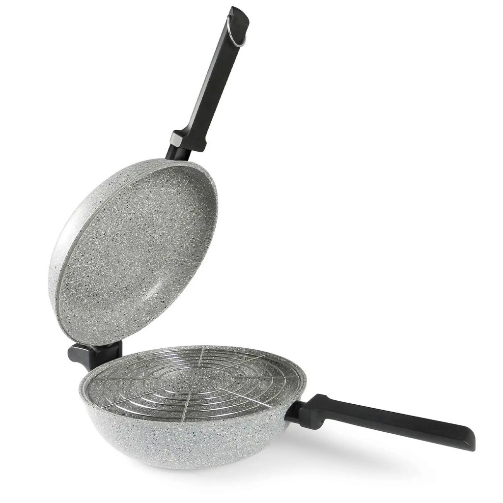 Rocky Twins - в єднанні сила! Революційний продукт, що змінює методи приготування. Один мультифункціональний кулінарний інструмент для смаження, варіння, пасерування, який можна використовувати як традиційну сковорідку, сковороду ВОК, сотейник, фритюрницю, пароварку, пастоварку та навіть міні-духовку. За допомогою запатентованої системи фіксації двох половин, сковорідки легко з'єднати, роз'єднати, або зафіксувати меншу з них під кутом 60°. Більше місця для приготування всередині - це те що відрізняє всю лінійку Flonal Dura Induction від багатьох інших сковорідок. Неймовірно широке дно при стандартних зовнішніх розмірах забезпечує рівномірне приготування більшої кількості їжі.