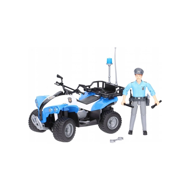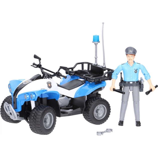 Модель полицейского квадроцикла от немецкого производителя качественных детских игрушек Bruder. Транспорт выполнен в типичных полицейских оттенках: синий и белый. У него большие шины с протекторами, наличие багажника для разных мелких предметов, а также оранжевая мигалка и антенна.