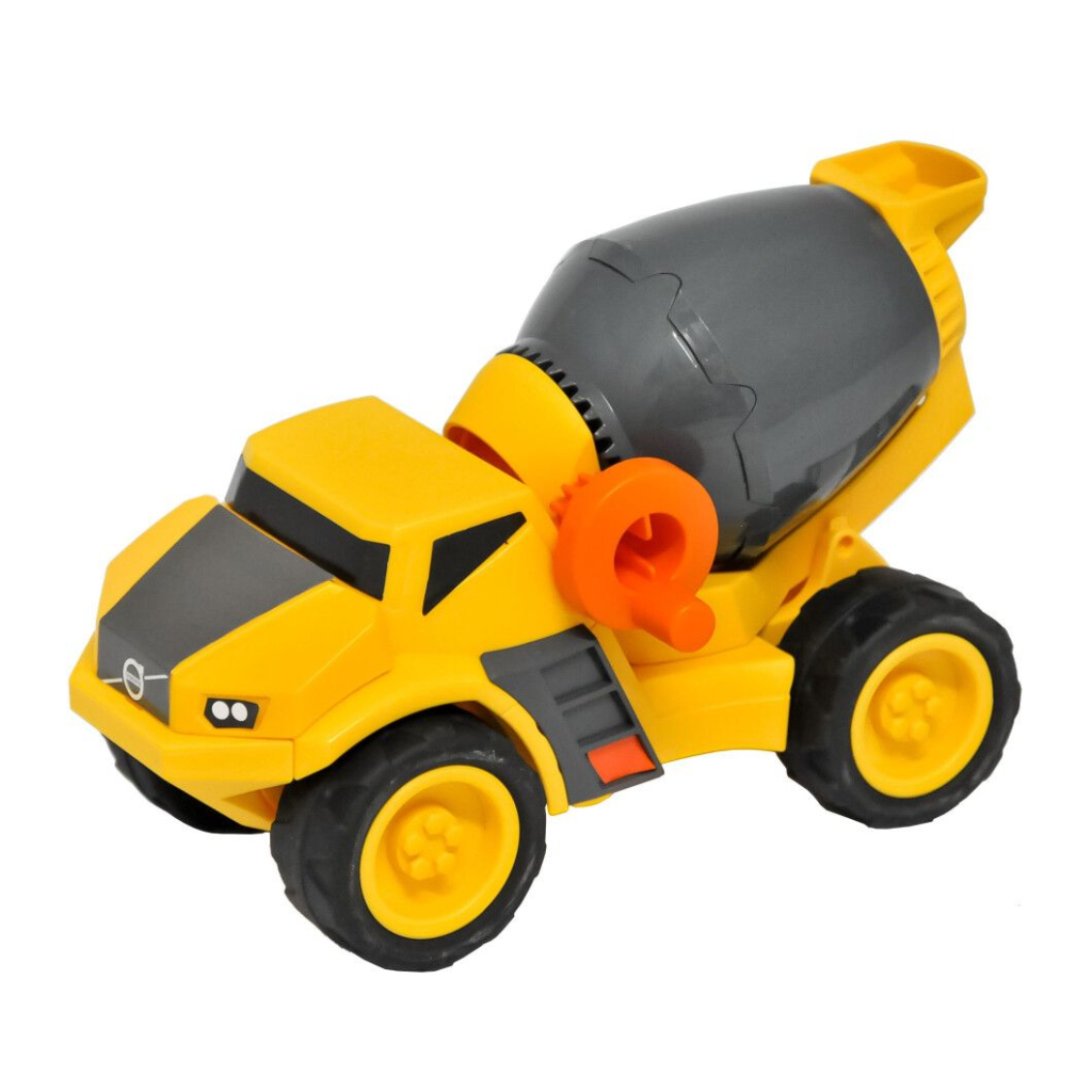Яркая серо-желтая машинка с подвижной бочкой, которая вращается за счет ручки, станет отличным подарком для маленьких любителей строительных авто.