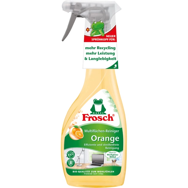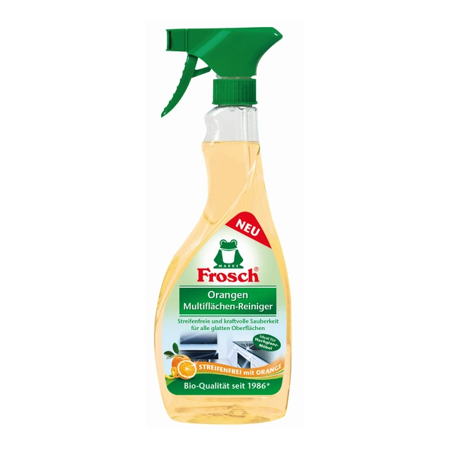 Моющая жидкость для уборки Frosch Апельсин 500 мл (4001499917349) — это сильнодействующий очиститель, который с помощью высокоэффективных жирорастворяющих биоэкстрактов из цедры апельсина и хорошо отмывающего грязь мыла надежно и без остатков убирает жир и грязь со всех поверхностей.