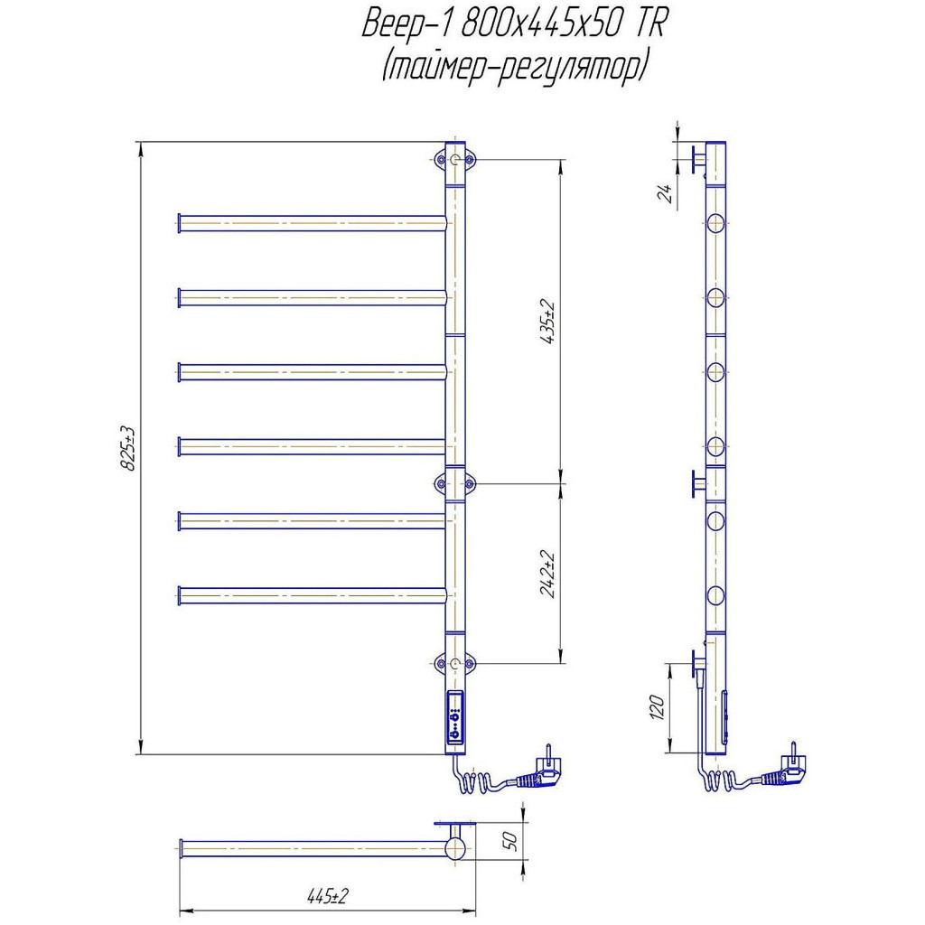 Электросушилка для полотенец бытовая Веер-I 800х445/55 TR. Оборудована таймер-регулятором. Возможна вариация с комплектом скрытого подключения. Имеет 6 ребр, которые вращаются на 180° и стояк из круглой трубы. Изготовлен из полированной нержавеющей стали без хромирования. Варианты покрытия: полированная. Температурные режимы таймер-регулятора: 40°С, 45°С, 50°С. Варианты времени: 3, 6 часов и постоянный нагрев. Мощность 80 Вт. Дополнительно для удобства использования можно оснастить навесными крючками. Гарантия – 5 лет.