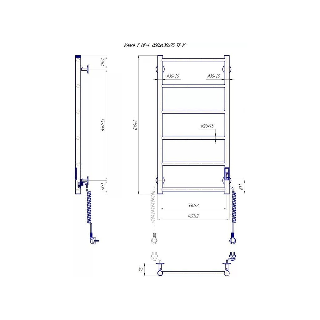 Электрополотенцесушитель бытовая Классик F НР-I 800х430/75 TR K. Оборудована таймер-регулятором и коннектором для подключения в розетку с любой стороны. Совместима с комплектом скрытого подключения. Имеет 6 ребер и стояков из круглой трубы.