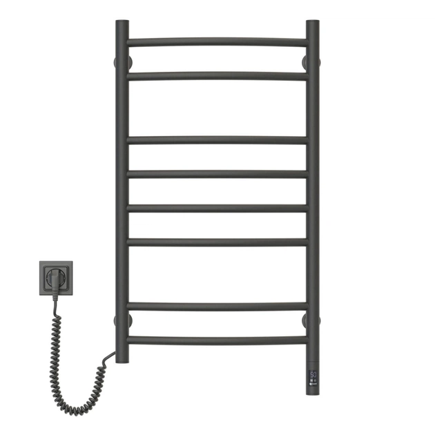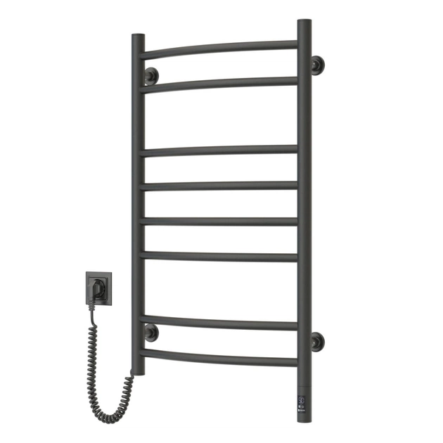 Электрический полотенцесушитель Камелия 480х800, левое подключение, сенсор с таймером, цвет – черный муар, от украинского производителя NAVIN, изготовлен из углеродистой стали, которая отличается высоким качеством и прочностью. Модель имеет порошковое покрытие. Толщина стенки перемычек полотенцесушителя составляет 1,5 мм, а стоек – 2 мм.