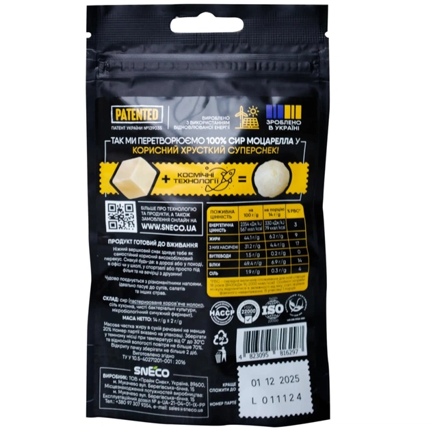 Это идеальный самостоятельный перекус, отличная закуска к напиткам или оригинальный ингредиент для ваших блюд. Продукт изготовлен без глютена, ГМО, красителей и консервантов — только 100% натуральный сыр и частичка украинской любви в каждой пачке.