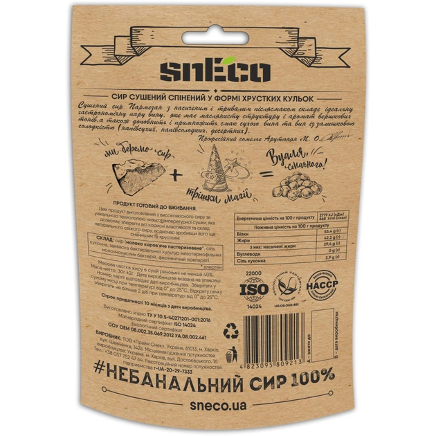snEco - самый хрустящий сыр на планете! А еще какой вкусный... Жемчужина нашего ассортимента – насыщенный и изысканный вкус этого итальянского сыра не спутать ни с чем! Сомелье рекомендуют его к вину и напиткам, а мы рекомендуем брать три сразу – ведь обычно его съедают еще до застолья! Произведено по запатентованной технологии и немного Украинской любви в каждой пачке.