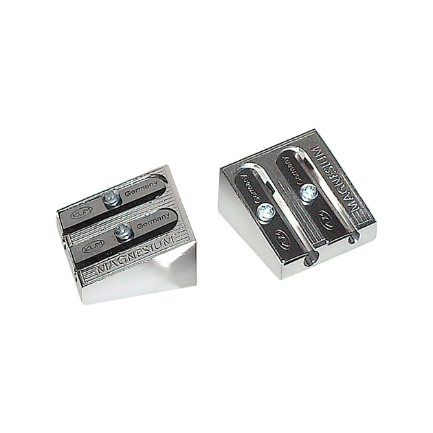 Металлическая точилка из сплава магния с 2-мя отверстиями. Маленькая и не тяжелая, всегда будет под рукой.