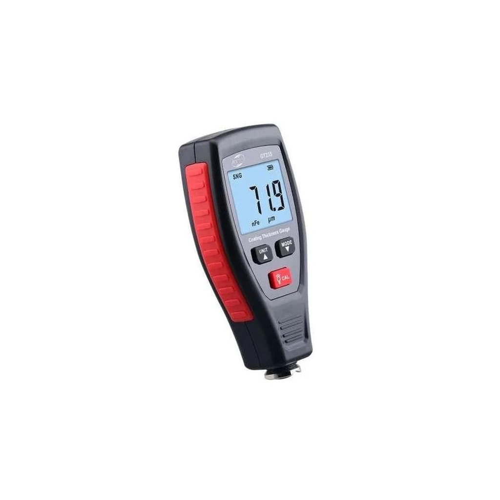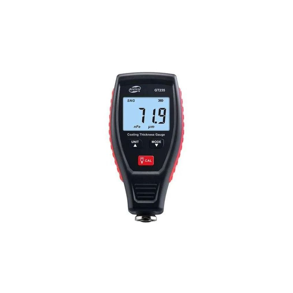 GT235 толщиномер лакокрасочного покрытия производства компании Benetech. Предназначением данного толщиномера является определение толщины слоя лакокрасочного, или другого покрытия на поверхности магнитных металлов (Fe) и не магнитных (NFe) в диапазоне от 0 мкм до 1800 мкм (1,8 мм). Для сохранения высокой точности измерения толщины лакокрасочного либо другого типа покрытия, после замены элементов питания или очень длительного хранения прибора в данном приборе предусмотрена функция калибровки (калибровка нуля, калибровка со смещением, базовая калибровка).