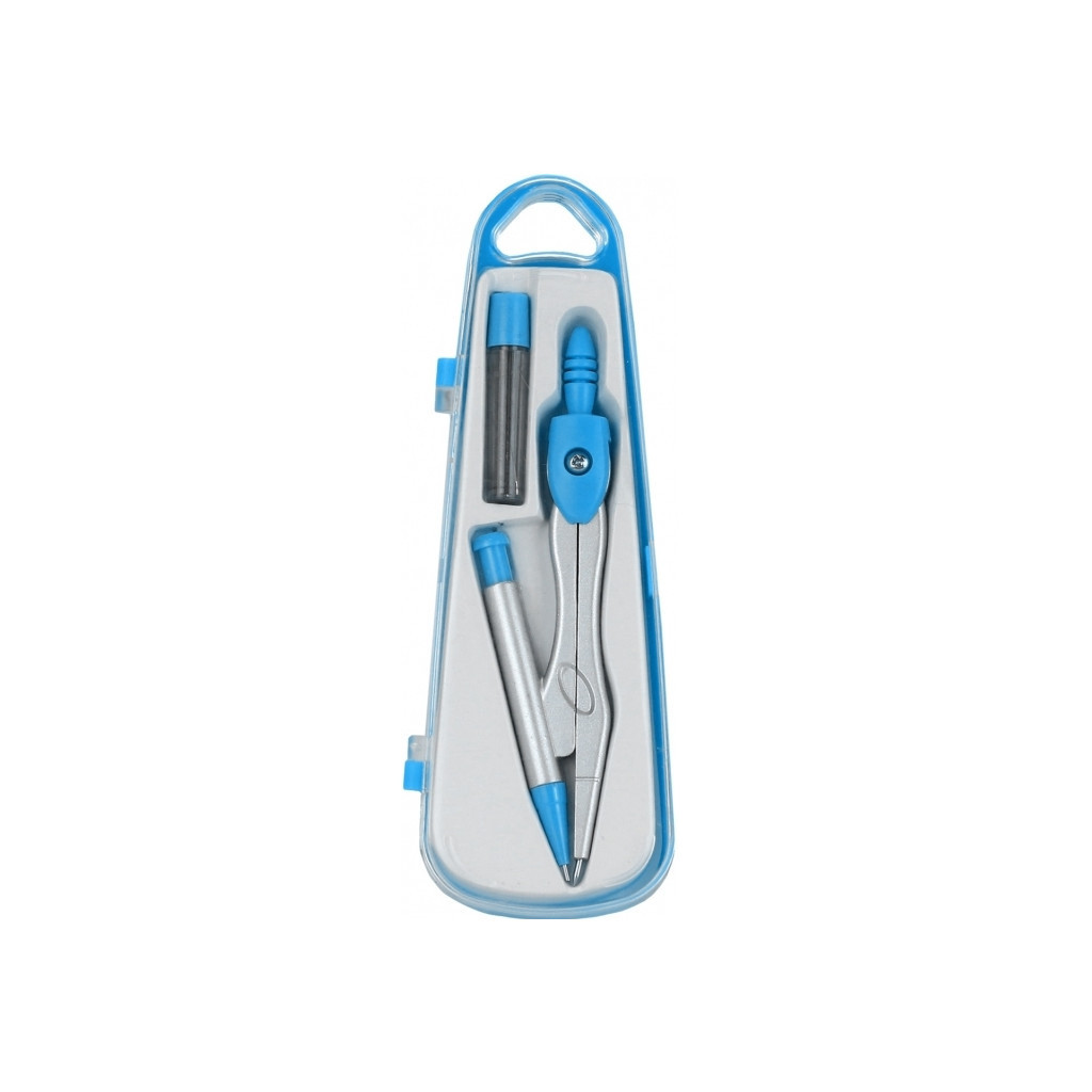 Циркуль металевий із запасними грифелями, у пластиковому пеналі з підвісом.