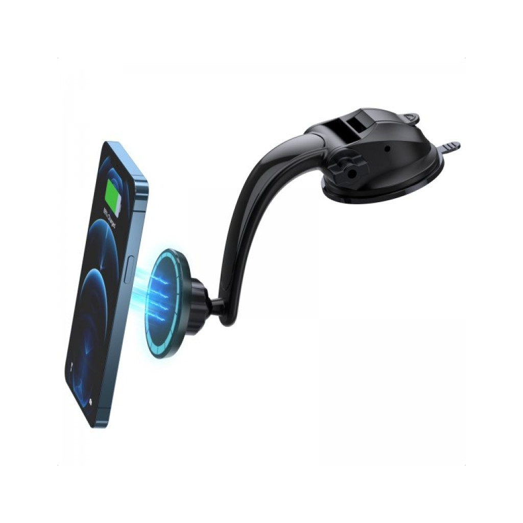 Держатель оснащён вакуумной присоской, которая легко устанавливается на лобовое стекло и обеспечивает стабильность фиксации. Конструкция позволяет вращать телефон на 360° и регулировать угол обзора для максимального удобства водителя. Магнитные кольца в комплекте не мешают зарядке смартфона, а качественные материалы (пластик, поликарбонат, магнит и резиновая присоска) гарантируют долгий срок службы аксессуара.