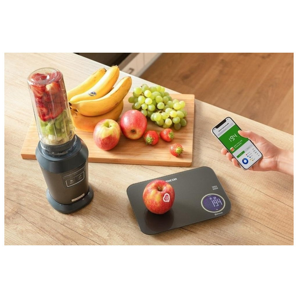 Кухонные весы Sencor. Оригинальное приложение Sencor FOOD, созданное в сотрудничестве с авторами Dine4Fit, с обширной базой данных продуктов питания. Предоставляет подробную информацию о потребляемой пище (углеводы, белки, жиры, холестерин, клетчатка и др.). ЖК-дисплей с белой подсветкой. 3 режима: режим взвешивания / режим измерения объема молока / режим измерения объема воды.