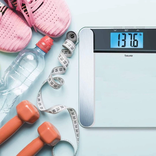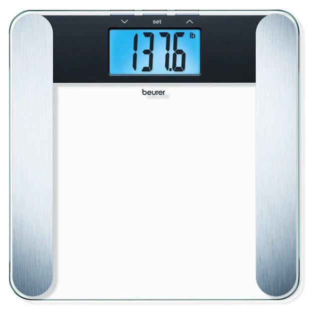 Большая опорная поверхность из стекла толщиной 8 мм. Очень большой дисплей с синей подсветкой. Вес, жировая и костная масса, доля влаги и мышечной ткани. Электроды из полированной нержавеющей стали. 5 уровней активности. Технология включения Quick Start. Автоматическое отключение, индикация перегрузки. Максимальный вес – 180 кг. Размер цифр 40 мм.