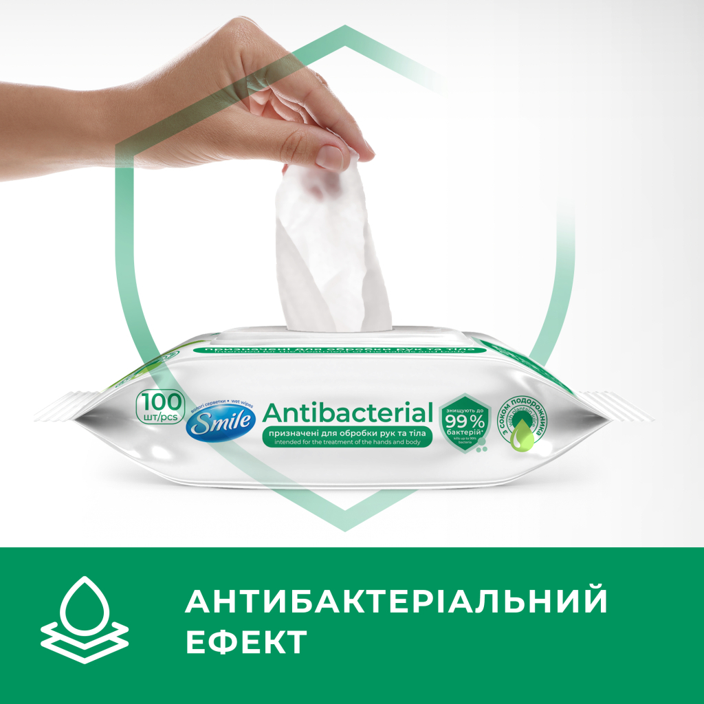 Влажные салфетки Smile Antibacterial безопасно и эффективно очищают кожу рук и тела, придавая ей ощущение свежести.