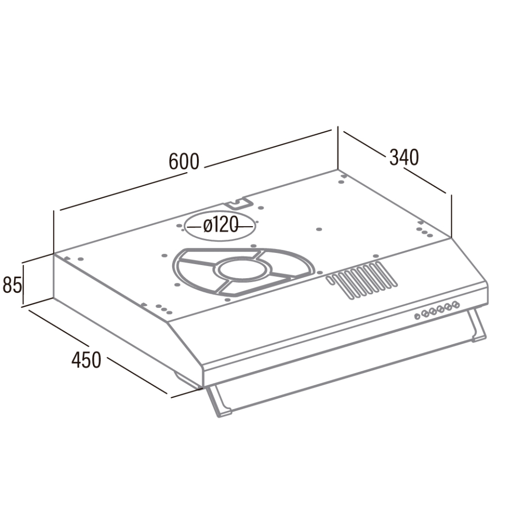 Подвесная вытяжка, отвод/рециркуляция, производительность 350 куб. м/ч (при свободном отводе воздуха), механическое кнопочное управление, 3 скорости, LED освещение, жироулавливающий фильтр.