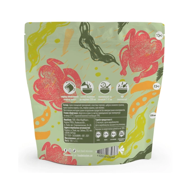 Гороховая каша Food Mission с куриным филе - это вкусное и питательное блюдо, которое сочетает в себе полезные свойства гороха и нежность куриного мяса. Этот продукт идеально подходит для быстрого и сытного перекуса в любых условиях: на работе, в путешествии или дома.