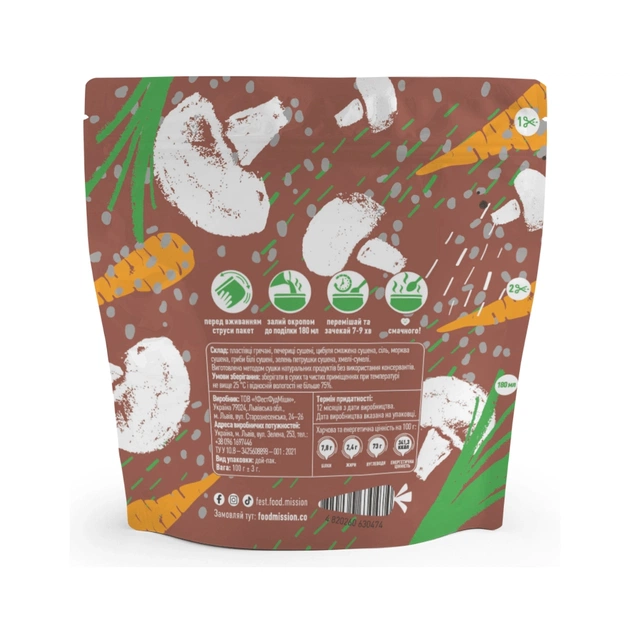 Гречка с грибами Food Mission - это вкусное и питательное блюдо, которое сочетает в себе полезные свойства гречневой крупы и аромат сушеных грибов. Этот продукт идеально подходит для быстрого и сытного перекуса в любых условиях: на работе, в путешествии или дома.