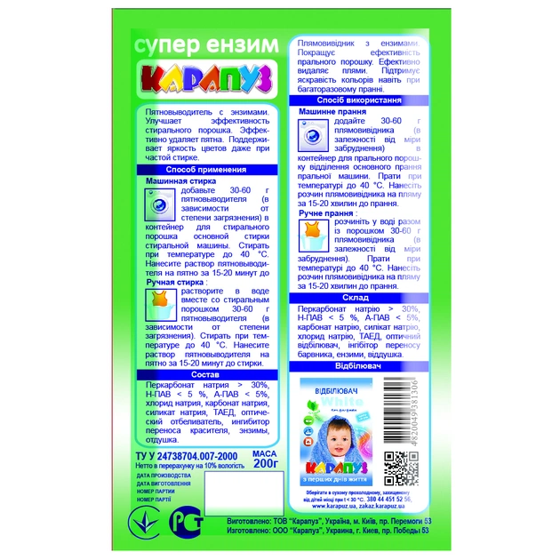 Засіб для видалення плям Карапуз для дитячих речей з ензимами 200 г (4820049381306)