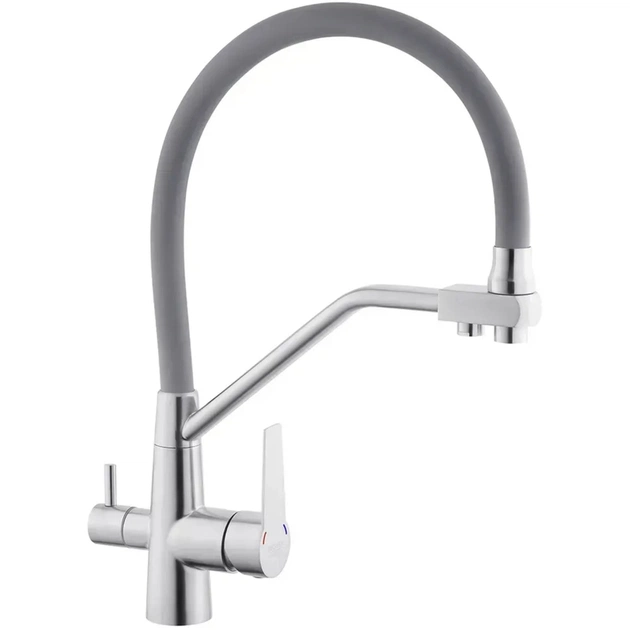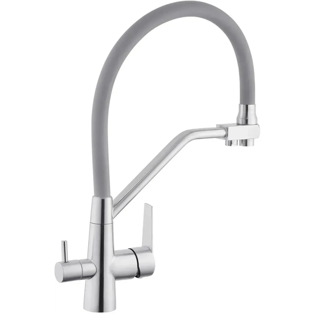 Смеситель для кухни с подключением к фильтру Kroner KRP Edelstahl Klassisch - ESG03817GRA изготовлен из высококачественной нержавеющей стали, которая не подвергается коррозии, устойчива к ударам и появлению трещин. Смеситель имеет U-образную форму с тремя контурами подключения воды. При участии первого и второго осуществляется подключение холодной и горячей воды, где смешивание происходит с помощью картриджа.