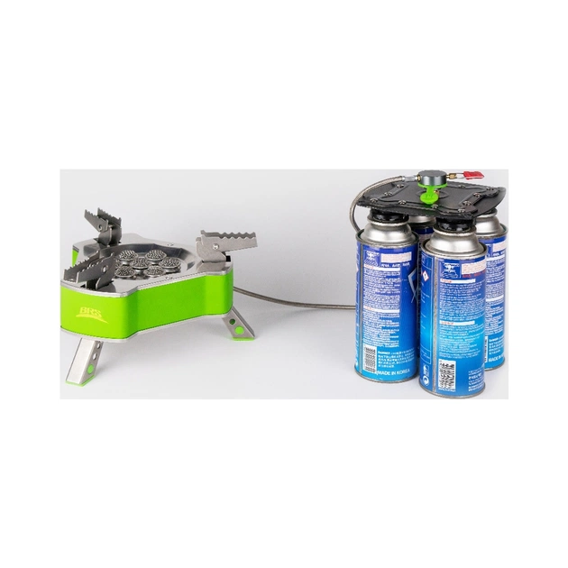 Конструкція BRS-Q5A є металевою пластиною з чотирма з'єднаннями, в кожне з яких вставляється газовий картридж. Ця дія виконується в один простий крок: касетний балон вставляється в з'єднання і повертається за годинниковою стрілкою до повної фіксації. Далі потрібно приєднати газовий шланг до центрового різьбового з'єднання, після чого пальник готовий до використання. Для від'єднання газгольдера потрібно виконати ті ж дії у зворотному порядку.