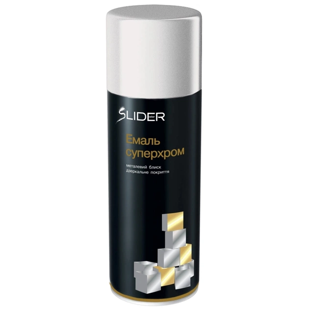 Емаль SLIDER Хром - фарба в аерозолі, надає ефекту металевого блиску поверхням. Застосовується для використання у декоративних цілях. Фарба швидко висихає, тому дуже зручна у використанні. Аерозольна фарба з ефектом хрому SLIDER широко і часто застосовується при передпродажній підготовці автомобілів, хромуванні молдингів, а також при ремонті свічників та статуеток.