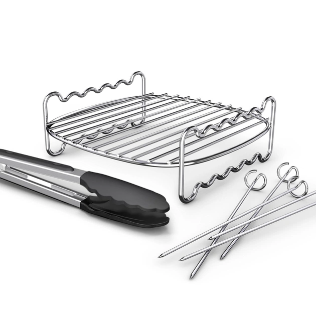 Завдяки дворівневій решітці, 5 шампурам та щипцям ви зможете легко, швидко та з користю для здоров’я приготувати на грилі або у фритюрі смачні бургери, курячі крильця, рибу та багато іншого. Легко виймайте їжу за допомогою зручних силіконових щипців.