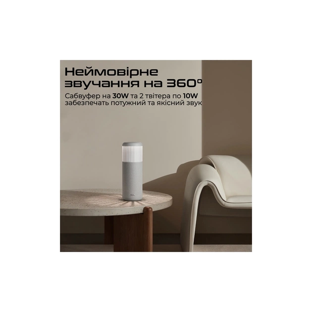 Обладнана двома каналами, ця система забезпечує неймовірне звучання на 360°. Завдяки вдосконаленим акустичним компонентам — сабвуферу на 30 Вт та двом твітеру по 10 Вт — ви отримуєте чистий звук з глибокими басами, що занурюють вас у улюблені мелодії.