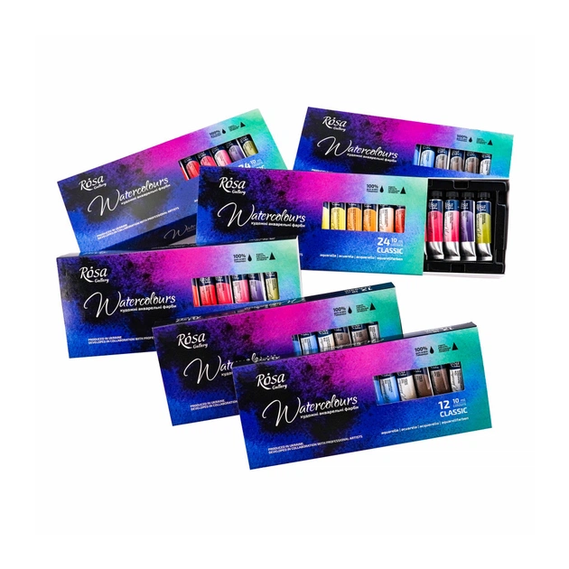 Набір акварельних фарб CLASSIC від ROSA Gallery в легкому картонному упакуванні з надихаючим дизайном та додатковим вікном через яке проглядаються туби.