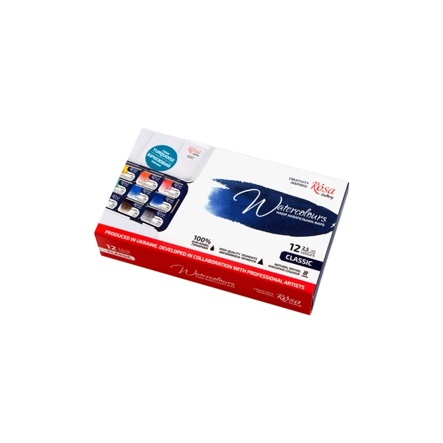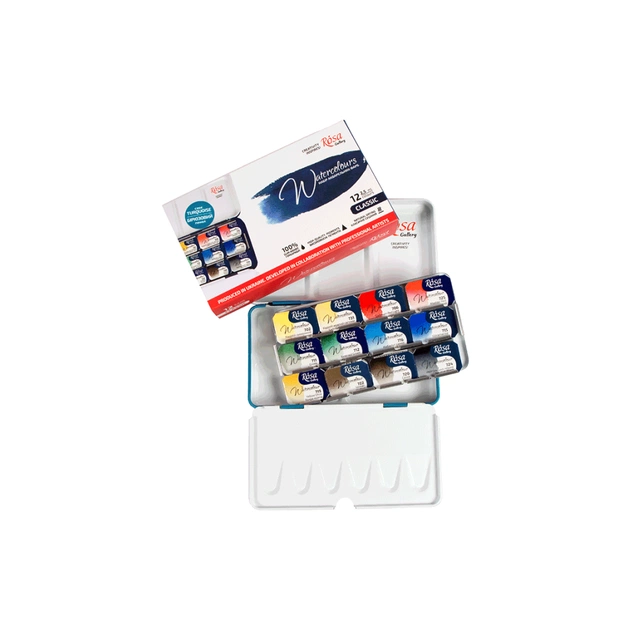 Набори Класика на 12 кольорів в пеналах: бірюзовому та індіго. Поєднують у собі традиційні кольори для техніки акварель. Більшість кольорів гами набору - одно пігментні, що дає можливість утворювати чисті відтінки при змішуванні. Металевий пенал зручний у роботі на пленері, в подорожі чи в студії. Він має дві палітри різної конфігурації та вставку для кювет.