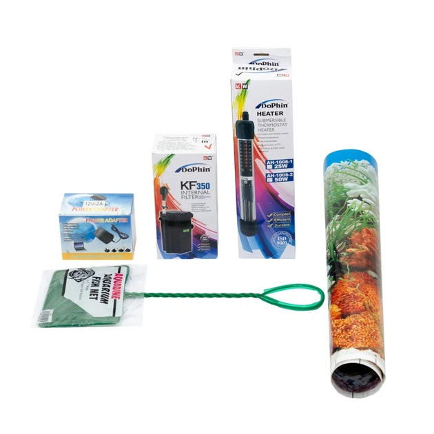 Конструкція акваріума виконана з якісного скла, шви проклеєні прозорим силіконом. Зверху резервуар оснащений пластиковою кришкою з вмонтованим в неї герметичним світильником. Фільтр проводить механічну чистку води за допомогою фільтрувальної губки та біологічну очистку — вугільним картриджем. Крім того, фільтр має високу пропускну здатність та добре підійде для прісних акваріумів. Водонагрівач оснащений терморегулятором, це допоможе підтримувати воду в температурному діапазоні від 20 до 34 градусів, в залежності від потреб мешканців.