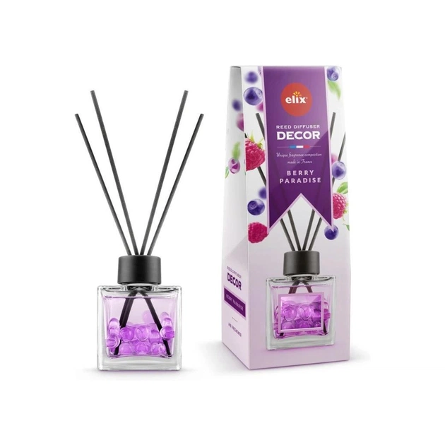 Пориньте у фруктово-ягідний рай разом з аромадифузором Elix Berry Paradise. Соковиті ноти чорної смородини, яблука і м’яти гармонійно поєднуються з солодкими акцентами персика, малини та ревеню. Легка база з тонких нот цукру і бобів створює ніжне і затишне відчуття. Декоративні гелеві кульки не лише прикрашають інтер’єр, а й допомагають насолоджуватись ароматом довше.