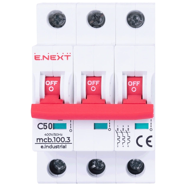 Модульний автоматичний вимикач e.industrial.mcb.100.3.C50, 3 г, 50А, C, 10кА призначений для захисту низьковольтних електричних мереж та обладнання від струмів навантаження та короткого замикання, а також нечастих оперативних комутацій електричних мереж. Виріб відповідає Технічним регламентам безпеки низьковольтного електричного обладнання та електромагнітної сумісності обладнання ДСТУ IEC 60947-1:2008, ДСТУ IEC 60947-2:2008, ДСТУ IEC 60898-1:2005