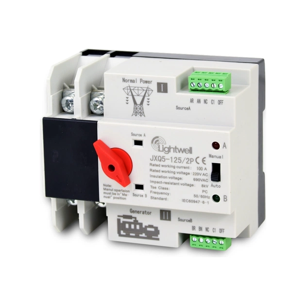 Lightwell JXQ5-125/2P для DIN-рейки — це побутовий подвійний автоматичний перемикач передачі електроенергії. Перемикач використовується для перевірки нормального стану основного або резервного джерела живлення. У разі порушення нормального живлення резервне джерело живлення негайно починає працювати, щоб забезпечити безперервність, надійність і безпеку електропостачання. Пристрій спеціально розроблено для побутової установки і використовується в розподільній коробці живлення. Автоматичний перемикач підходить для системи аварійного електропостачання зі змінним струмом 50 або 60 Гц номіналом 400В, 100А. Має компактну структуру, надійний у передачі, зручний в установці та обслуговуванні, має тривалий термін служби. Широко використовується в різних випадках, коли не допускається безперервне відключення електроенергії, може управлятися як електрично, так і вручну.