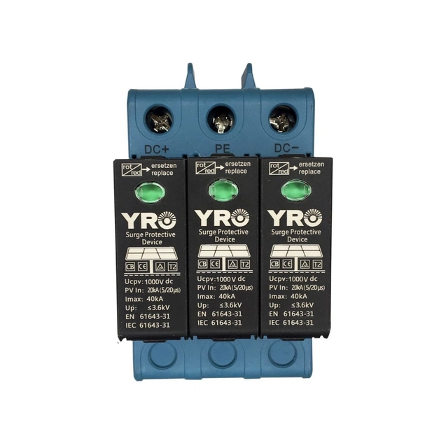 Захист від перенапруг YRSP-D2 DC SPD 3P 20-40KA 1000Vdc T2 – це надійний та якісний пристрій, призначений для захисту електричної мережі від можливих перенапруг. Цей триполюсний захисний пристрій має номінальну напругу 1000Vdc і здатний витримувати стрибки струму до 20-40KA.