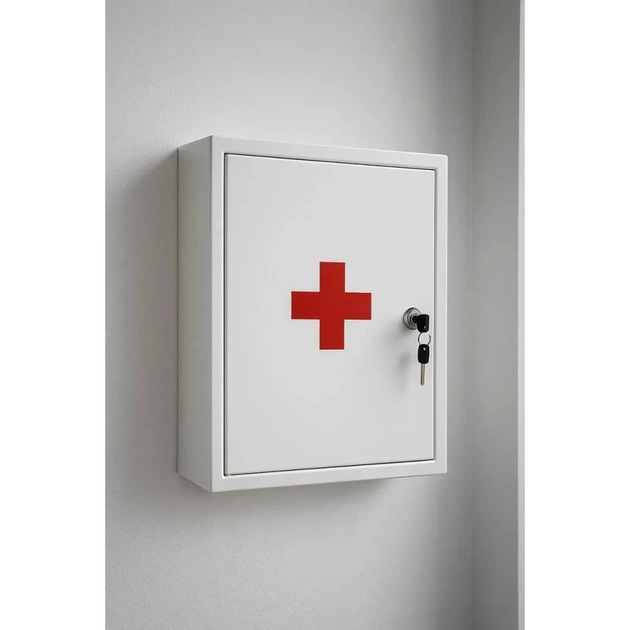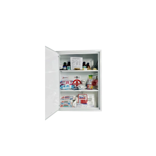 Аптечка містить вироби для обробки та перев'язки ран, антисептичні, дезінфекційні, протиопікові засоби, які стануть в нагоді при різного роду незначних травмуваннях Металевий кейс для медикаментів можна розмістити в зручному доступному місці прикріпивши до стіни в цеху, на виробництві, на складі. Довідник з надання першої допомоги та рекомендації щодо застосування вкладень допоможуть вам швидко та ефективно використати медичний виріб ( засіб) за призначенням. В залежності від напрямку діяльності виробництва та видів травмувань - рекомендується доукомплектовувати додатковими засобами першої допомоги.