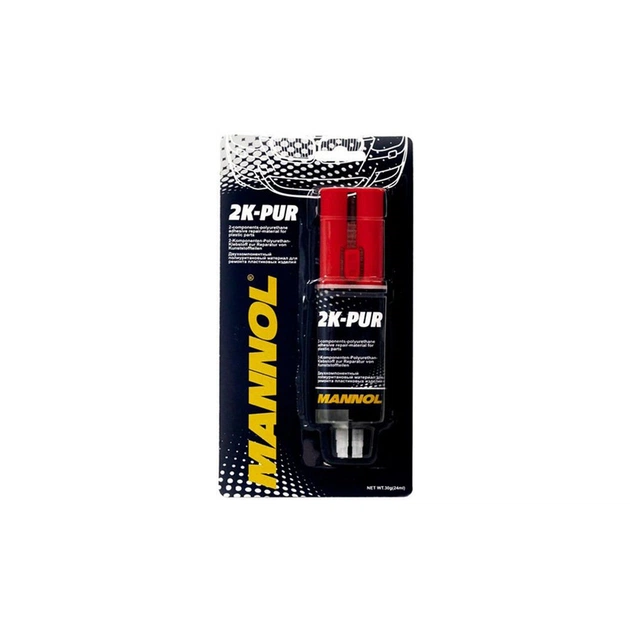Mannol 2K-PUR — двокомпонентний клей для структурного та косметичного ремонту виробів із пластику, металу, дерева, каменю тощо. Повне затвердіння для можливого механічного оброблення: 2-3 години за кімнатної температури. Упродовж тривалого часу зберігає еластичність, не осідає, стійкий до погодних впливів і старіння. Зберігати цей продукт у щільно закритому оригінальному пакованні в сухому приміщенні за температур від +5 до +25 °C.